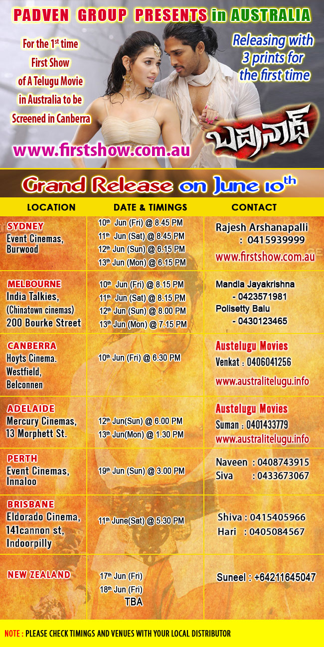 Bhadrinath is first telugu movie releasing in australia for firstshow.